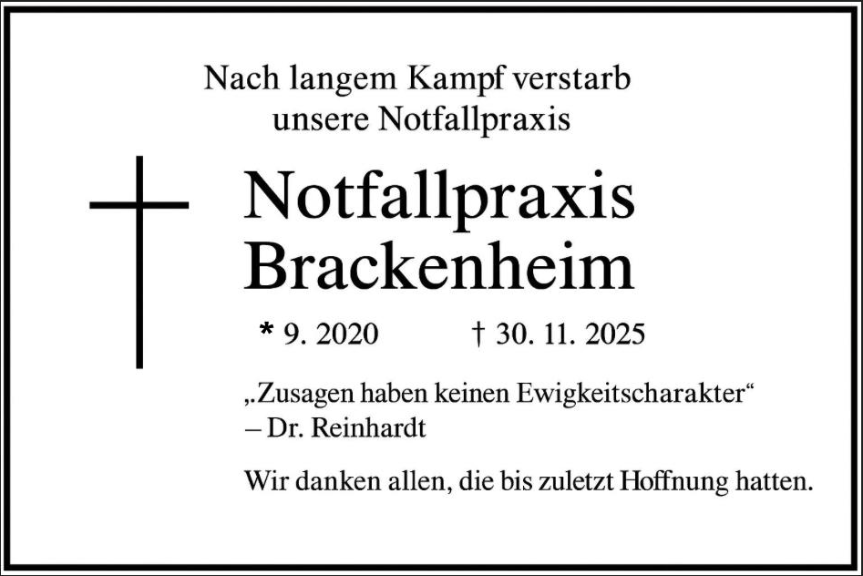 mit großem Bedauern müssen wir Euch heute informieren: Die Notfallpraxis in Brackenheim wird zum 30. November geschlossen.